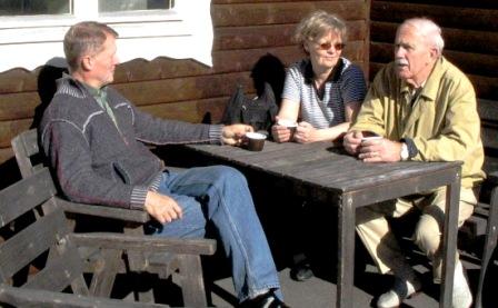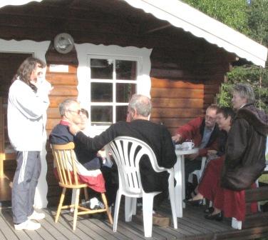 | 5: Trevlig samvaro vid en av campingstugorna | 6: En extra kopp kaffe på morgonen, efter en stadig frukost, sitter bra! |